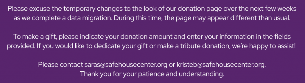 Email donations@safehousecenter.org if you have any questions.