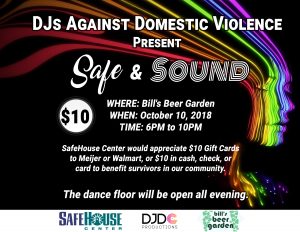 We invite you to join us for Safe and Sound, a night of great sound to benefit SafeHouse Center! Swing by Bill’s Beer Garden to enjoy great music courtesy of DJ DC Productions, LLC, great drinks, and a great atmosphere. The dance floor will be open all night!